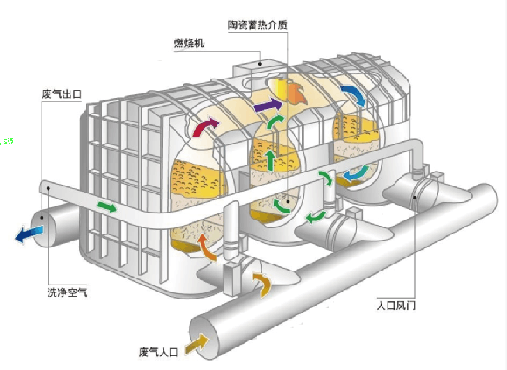 底盤(pán)整體噴漆線廢氣濃縮焚燒系統(tǒng)RTO的核心是氧化室和蓄熱室,分別提供氧化反應(yīng)所需要的反應(yīng)時(shí)間和溫度條件,RTO設(shè)備主要由上室體、下室體、風(fēng)閥、加熱系統(tǒng)、風(fēng)機(jī)、超溫泄放裝置等組成。利用陶瓷熱交換填料的熱特性快速吸收熱氣(燃燒處理后的凈化氣)的熱量,用于冷氣的升溫,填料交替性地分別與熱氣或冷氣相互接觸,降低燃料的消耗量,節(jié)約能源。RTO設(shè)備共有3個(gè)蓄熱室,在下室體通過(guò)切換閥的動(dòng)作,使上室體3個(gè)蓄熱室輪流處于進(jìn)氣放熱、吹掃凈化、排氣蓄熱狀態(tài),循環(huán)往復(fù),連續(xù)工作。