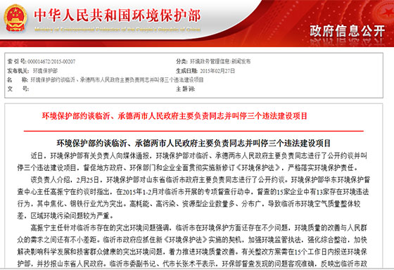環(huán)保部刊發(fā)約談臨沂市長原文:《環(huán)境保護部約談臨沂、承德兩市人民政府主要負責(zé)同志并叫停三個違法建設(shè)項目》