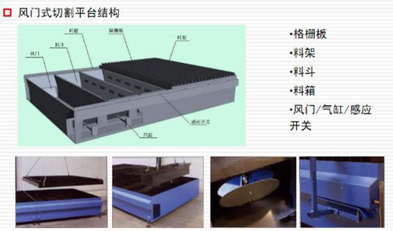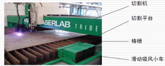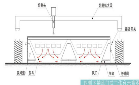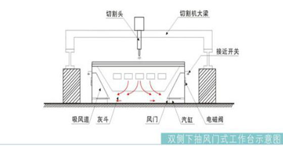 切割平臺的抽風(fēng)系統(tǒng)有效集中在切割機所在區(qū)域(寬度為切割平臺寬度,長度方向約1m),該區(qū)域隨切割頭移動而移動,有效節(jié)省了抽風(fēng)量。
