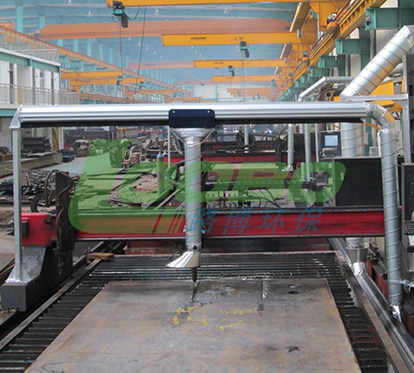 在切割平臺一側(cè)安裝方形吸風(fēng)道,吸風(fēng)道上方裝有一個可隨切割機一起移動的吸風(fēng)小車,并在切割平臺的另一側(cè)裝有吹風(fēng)風(fēng)機?;瑒游L(fēng)小車切割頭吹風(fēng)風(fēng)機安裝在切割機沿衡量方向的同一直線上。利用切割平臺上的格柵板與切割鋼板形成“煙氣通道”。切割鋼板時,吹風(fēng)風(fēng)機將產(chǎn)生的切割煙塵通過“煙氣通道”吹向吸風(fēng)小車吸風(fēng)口,進入方形吸氣風(fēng)道,最后進入凈化器主機進行切割煙塵凈化處理。
